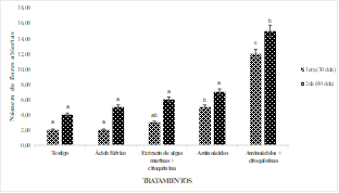 Figura 4. Número de flores abiertas por efecto de la aplicación de bioestimulantes en el cultivo de cacao clon CCN-51. Letras distintas son estadísticamente diferentes de acuerdo al test de Tukey al 5% de probabilidad.