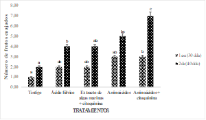 El promedio de número de frutos cuajados se muestra en la (Figura. 5) se determinó que hubo significancia estadística con un coeficiente de variación de 16,35 % con respecto a la evaluación de los 40 días después de la aplicación.
