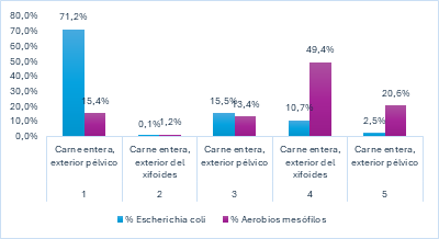 De las muestras analizadas, se observó que la tercena 1 presentó la mayor carga microbiana en el área del exterior pélvico, con un 71.2% de Escherichia coli. Por otro lado, la tercena 4 mostró la mayor carga microbiana en el exterior del xifoides, con un 49.4% de Aerobios mesófilos (ver Tabla 1).