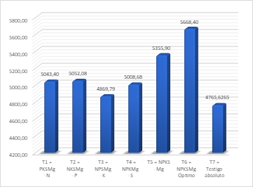 Con respecto al fósforo se encontró que el tratamiento T5 (NPKS -Mg), mostró mayor eficiencia agronómica al aumentar en 9.96 kg.ha-1 su producción cuando se incluye éste elemento en el cultivo T6 (NPKSMg), para el potasio la omisión de fósforo T2 (NKSMg – P) y magnesio T3 (NPSMg – K) mostraron mayor eficiencia al aumentar 3.62 y 3.46 kg.ha-1 su producción respectivamente cuando se omite éste elemento, T3, la omisión de azufre (T4), no muestra eficiencia en ningún elemento, de igual manera, el magnesio muestra que no existió antagonismo con K y se logra aumentar 4.52 kg.ha-1 de grano por kilo de K2O aplicado.