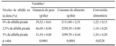 Los resultados promedios de las variables en estudio en la fase de engorde se muestran en la tabla 1, en donde se observa que los niveles crecientes alfalfa picada (%), influyeron significativamente (p>0,05) sobre las variables evaluadas, obteniéndose los mejores resultados con nivel de inclusión del 2,5% en cada variable.