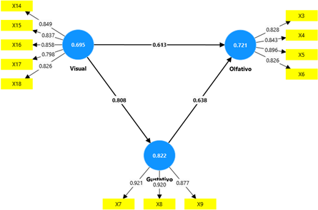 Para el estudio se utilizaron cinco variables: cuatro variables latentes que actúan como variables predictoras (factor sensorial visual, olfativo, y gustativo) y la decisión de compra como variable de respuesta.