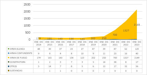 Figure 5. Intentional Homicides by Type of Weapon, 2014–2023 (January–December)