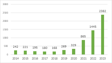 The deterioration of security in Guayaquil is evidenced by the marked increased in intentional homicides (see Fig. 4), which rose by 884.3% between 2014 and 2023, a period during which a total of 6,296 intentional homicides were recorded (MTSI, 2024). This alarming escalation of violence prompted the central government to implement various strategies aimed at curbing this type of crime; however, these measures have failed to significantly contain criminal activity (CIDOB, 2021; Primicias, 2023).