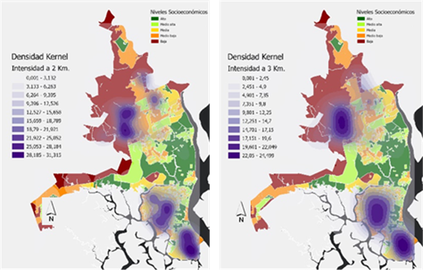 Kernel Density Analysis made it possible to measure the intensity and concentration of homicides across different areas of Guayaquil, using search radii of 2 and 3 kilometers. The results reveal that homicides tend to concentrate in areas characterized by lower-middle and low socioeconomic levels, with a particularly high incidence in the northern and southern sectors of the city. In southern Guayaquil, the concentration is notably higher, reflecting significantly elevated intensity values. These areas are predominantly characterized by socioeconomic levels ranging from low and lower-middle class to middle class (see Fig. 7).