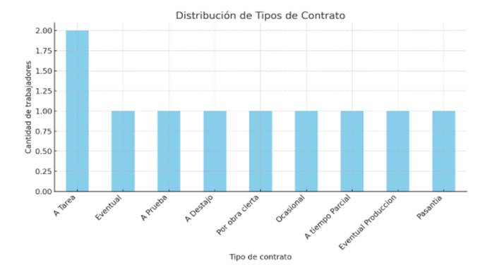 Figure 1 presents the distribution of the types of contracts identified in the study. The most frequent contract type identified was the task-based contract (A Tarea) (n = 2), followed by others such as temporary (Eventual), probationary (A Prueba), piecework (A Destajo), and specific project (Por obra cierta), each represented by one case. This variety indicates a mixed use of contractual modalities, possibly adapted to different operational needs. The low repetition of contract types suggests a lack of standardization in employment relationships, which may have implications for employee stability.