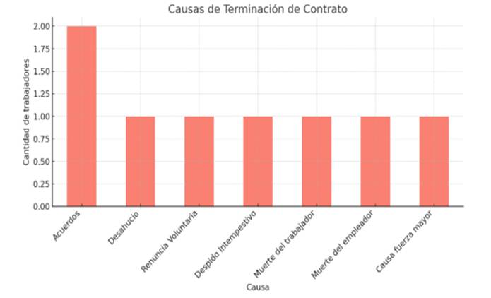 Figure 2 illustrates the reasons for which employment relationships were terminated. The most frequent ground identified was mutual agreement (n = 2), followed by causes such as voluntary resignation, wrongful dismissal, and other events including death of the employee or force majeure, each with one case. These results reflect a diversity of grounds of termination, with a predominance of consensual decisions, which may be interpreted as a negotiated approach to the management of contract termination.