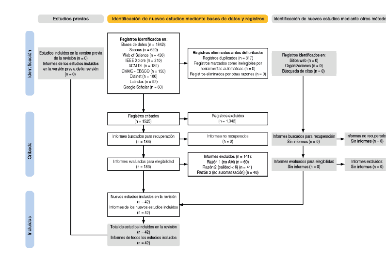 Con la estrategia descrita se recuperaron 1842 registros únicos. Tras una depuración de duplicados en Zotero —que eliminó 317 referencias (17%)—, quedaron 1525 títulos y resúmenes para el cribado preliminar. Dos criterios definieron la Tabla 1 de elegibilidad: pertinencia temática (estrategias de AM frente a bots, deepfakes o algoritmos) y solidez metodológica (calidad ≥ 6/8 en la JBI Critical Appraisal Checklist1). En la primera criba se excluyeron 1342 registros por carecer de enfoque de AM o ignorar el componente de automatización. Los 183 textos completos restantes pasaron a evaluación detallada; finalmente, 42 estudios reunieron todos los requisitos. La fiabilidad interevaluador alcanzó un coeficiente Kappa (κ=0,81), valor clasificado como ‘casi perfecto’ (Landis y Koch, 1977).