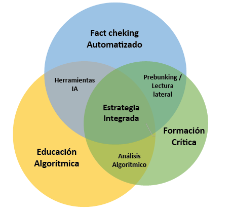 La presente investigación propone un modelo integrado de AM que articula tres ejes: formación crítica, verificación automatizada y educación algorítmica. Este artículo, a través de una revisión sistemática crítica de la literatura (2019–2025) basada en el protocolo PRISMAScR (Tricco et al., 2018), identifica y sintetiza las estrategias más eficaces de AM frente a la desinformación automatizada (bots, deepfakes y sesgos algorítmicos). Los hallazgos muestran que la combinación de estos tres ejes alcanza un tamaño de efecto agregado de aproximadamente g ≈ 0.70, evidenciando una sinergia pedagógica significativa. Se evalúa la pertinencia de este modelo para los programas universitarios de Comunicación y Educación en contextos latinoamericanos, dialogando con las perspectivas de la comunicación, la educación y la tecnología informativa.