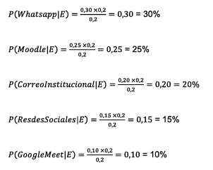 Sustituyendo estos valores en la Ecuación 4, se calcularon las probabilidades posteriores, destacando que WhatsApp y Moodle presentaron la mayor efectividad percibida, como se detalla a continuación: