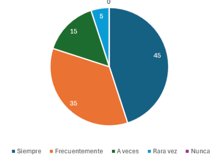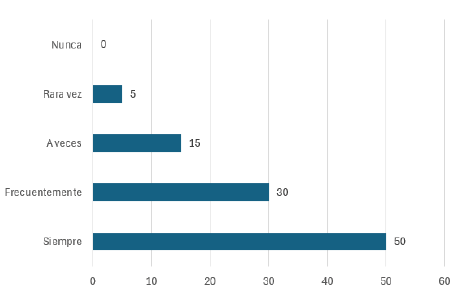Respecto a la evaluación crítica de la información, el 50 % afirmó que siempre realiza esta revisión, el 30 % lo hace frecuentemente y un 15 % lo hace a veces; solo el 5 % realiza esta práctica de manera rara o nula. Esto indica que los usuarios muestran conciencia sobre la importancia de validar fuentes, aunque la formación continua podría fortalecer las habilidades de evaluación crítica, especialmente para los estudiantes más jóvenes o con menor experiencia investigativa. En la Figura 3 se visualizan los resultados sobre la evaluación de la calidad y confiabilidad de la información.