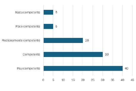 El 40 % de los participantes se considera muy competente y el 30 % competente al buscar fuentes confiables. Un 20 % se considera medianamente competente, mientras que solo un 10 % indicó tener poca o ninguna competencia. Estos datos sugieren que la mayoría de los usuarios posee habilidades básicas o avanzadas en la búsqueda de información, aunque un grupo significativo requiere apoyo para mejorar la eficacia en la selección de recursos confiables y especializados.