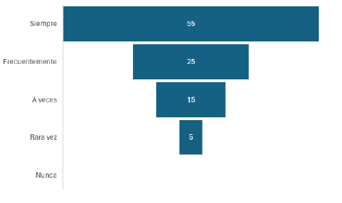 El 45 % de los encuestados indicó que siempre identifica la necesidad de información antes de iniciar una actividad académica, mientras que un 35 % respondió que lo hace frecuentemente. El 15 % señaló que lo hace a veces y solo un 5 % indicó rara vez. Estos resultados reflejan que la mayoría de los usuarios de la Biblioteca Central Dr. Alejandro Muñoz Dávila reconoce la importancia de planificar la búsqueda de información como parte del proceso académico, aunque existe un pequeño grupo que podría beneficiarse de estrategias de sensibilización sobre la identificación temprana de necesidades informativas. En la Figura 1 se representa la frecuencia de identificación de la necesidad de información.
