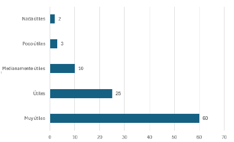 El 60 % de los usuarios considera los servicios y recursos de la biblioteca muy útiles, un 25 % los encuentra útiles, mientras que un 10 % los percibe como medianamente útiles y un 5 % poco o nada útiles. Esto demuestra que la infraestructura, el acceso a bases de datos y la asesoría bibliotecaria son altamente valorados por la comunidad académica, aunque es recomendable mejorar la difusión de ciertos servicios y capacitaciones para aumentar la efectividad de la biblioteca en el desarrollo de competencias informacionales. En la Figura 5 se representa la percepción que presentan los usuarios sobre la utilidad de los recursos de la Biblioteca Central Dr. Alejandro Muñoz Dávila.