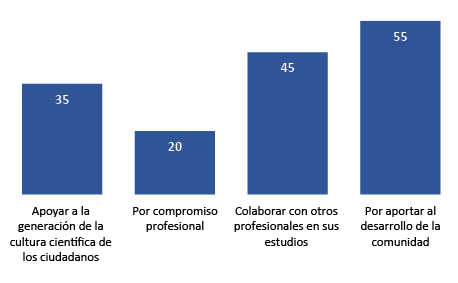 Se evidencia además que el 58.3 % se siente motivado por apoyar la cultura científica de los miembros de la comunidad, o sea, contribuir a reconocer cuanto la ciencia le puede aportar para su crecimiento personal y el de la propia colectividad. Ahora bien, destaca que solo el 33.3 %, lo ve como un compromiso profesional, aspecto que puede estar asociado a los elementos que obstaculizan su participación activa en estos procesos, tanto de investigación como de comunicación de los resultados que se obtienen.