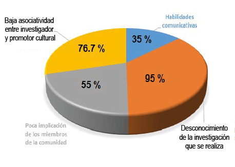 Otro obstáculo que tienen como percepción de ocurrencia es la relativa a la implicación de los miembros de la comunidad, por ello un 55 %, lo señala como una de las posibles condicionante que impida realizar una eficiencia acción de comunicación de la ciencia y la innovación. No obstante, resulta alentador que solo un 35 % manifieste que no posee habilidades comunicativas para ejecutar actividades en este sentido. (ver Fig. 2).