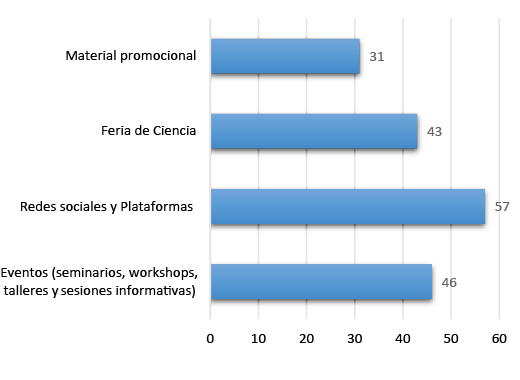 Este aspecto refuerza el criterio de varios autores (Davis et al., 2018; Seethaler et al., 2019; Nadkarni et al., 2019), quienes manifiestan que, para comunicar la existencia de un proyecto y sus avances, se recurre en la actualidad a diversos medios o formas, tales como infografías, imágenes o vídeos adaptados a las diferentes redes sociales como Facebook, Instagram, Youtube o Tik-tok, así como, a la organización de conferencias, producción de audiovisuales, exposiciones o eventos lúdicos. Por supuesto, las redes sociales, constituyen hoy los medios de comunicación preferidos por gran parte de la ciudadanía.